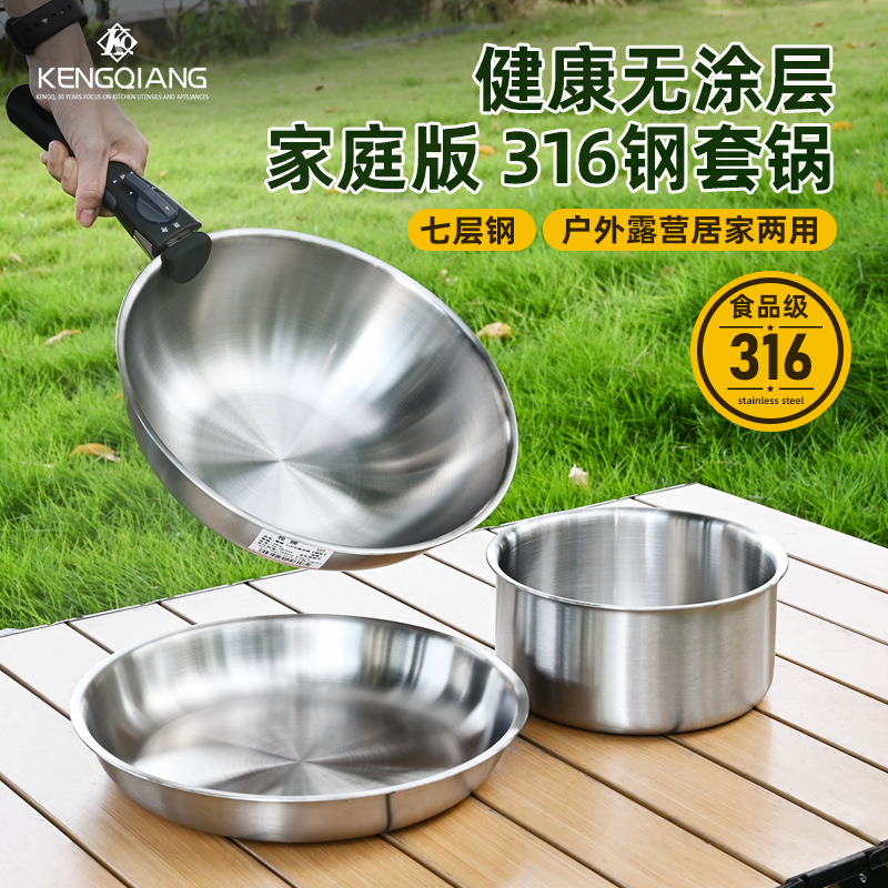 Peralatan Panci Luar Ruangan 316 Panci Goreng Baja Tahan Karat Peralatan Panci Kecil Berkemah Set Tiga Potong Panci Piknik Portabel Dapat Dilepas