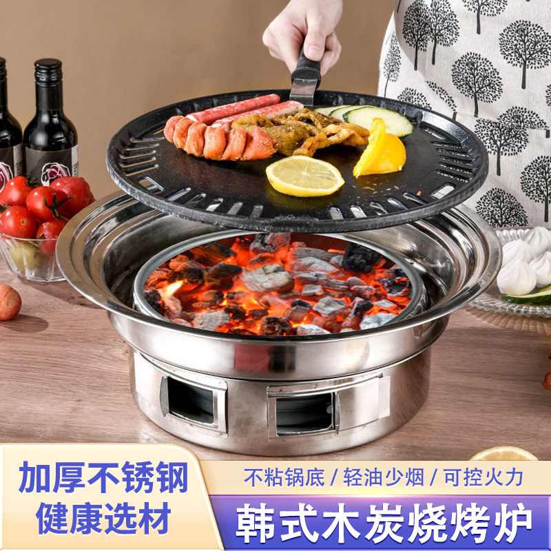 Oven barbekyu stainless steel, gaya Korea rumah tangga arang bulat anti lengket oven barbekyu luar ruangan komersial portabel berkemah karbon oven