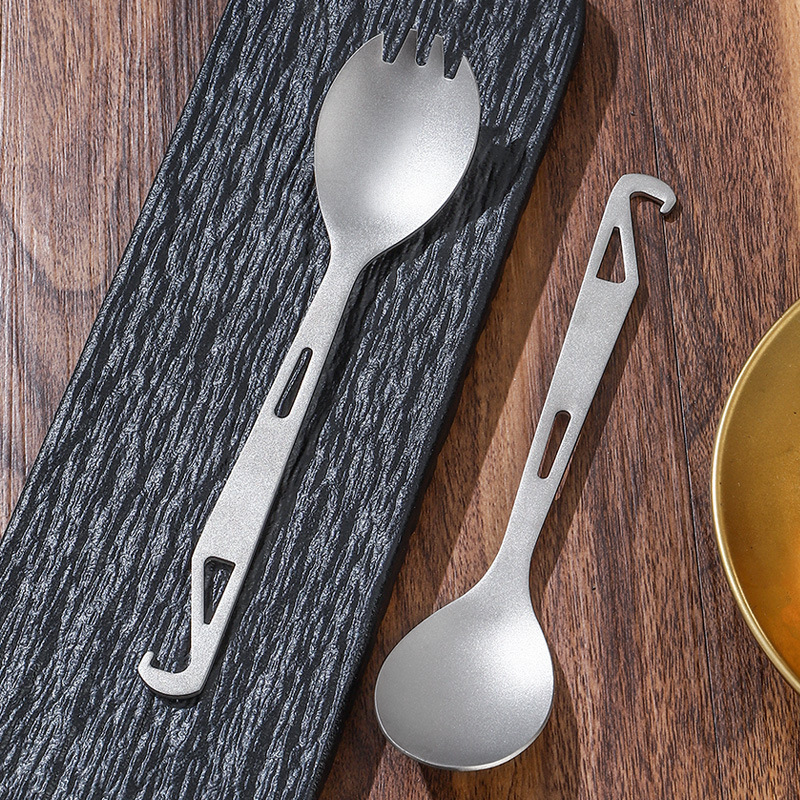Sendok sup portabel titanium murni untuk berkemah, perjalanan luar ruangan, sendok salad, kue, garpu buah penggunaan ganda, pembuka botol