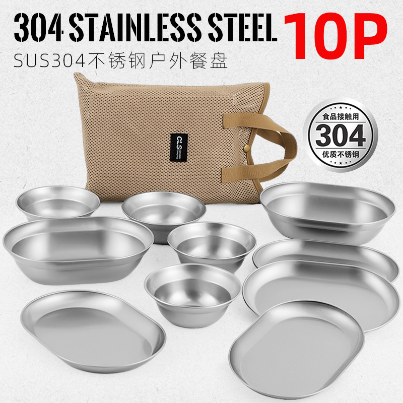 CLS setelan piring baja tahan karat, piring berkemah berkendara sendiri barbekyu berpergian peralatan makan berkemah set 10 buah mangkuk baskom sup