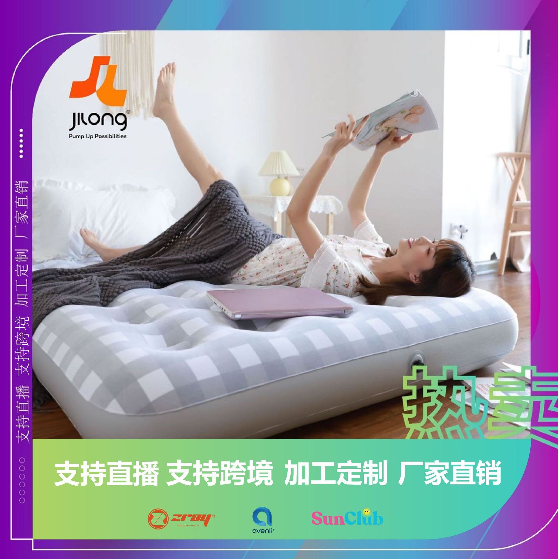 JILONG tempat tidur tiup dobel rumah tangga, tempat tidur kotak-kotak bantal udara luar ruangan, kasur tiup dipertebal bantal udara ekstra besar