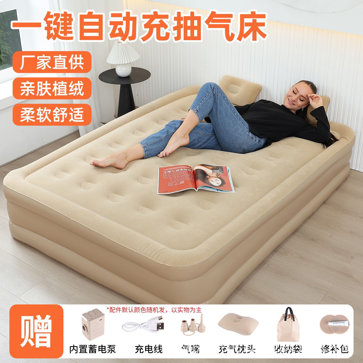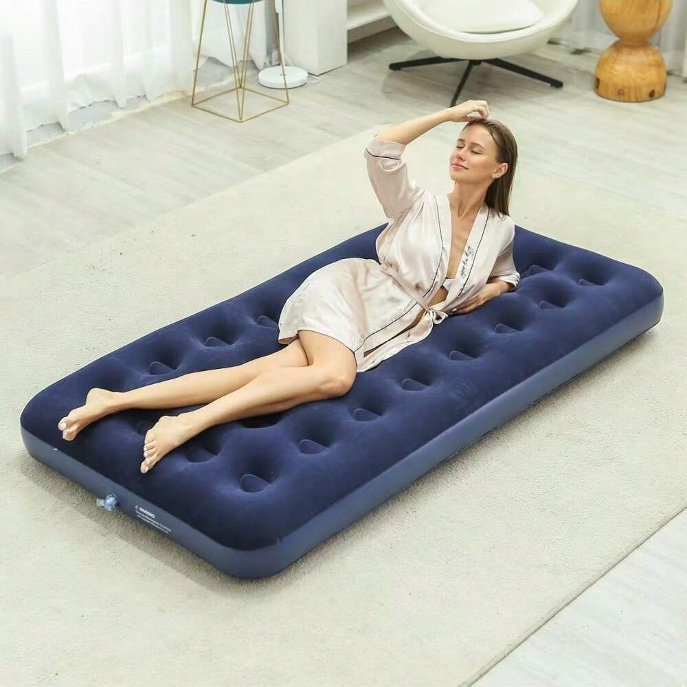 Kasur tiup portabel lipat untuk berkemah, penggunaan di rumah, berlapis flok, tahan aus, kasur lantai untuk orang yang malas, kasur udara untuk berkemah.