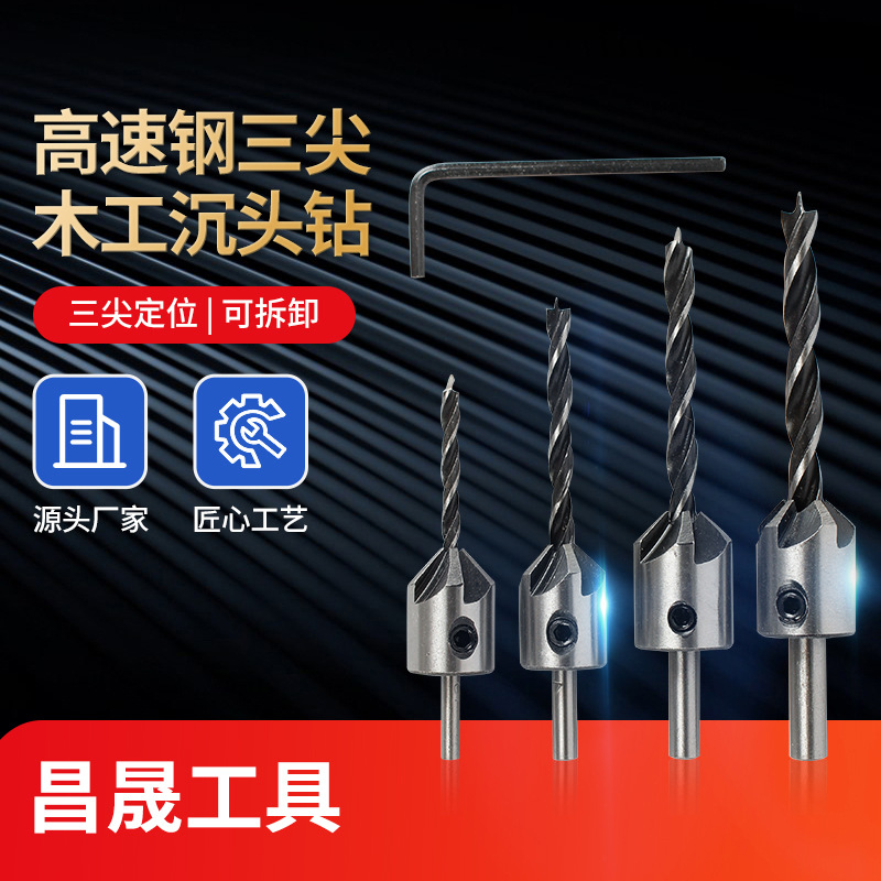 5PC三尖木工钻木工定位沉孔钻打孔扩孔麻花钻圆柄批发钻头