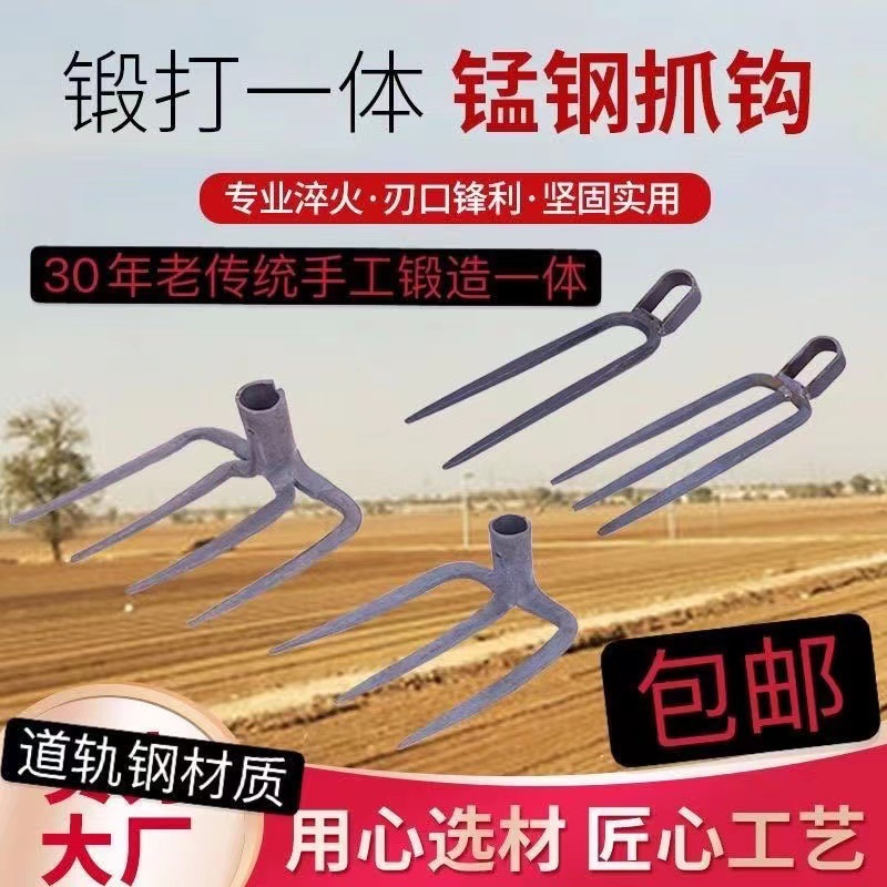Kait penggali baja mangan, tempa tangan, terintegrasi tiga cakar, tiga kait, cangkul dua cakar, garu pertanian tiga gigi, garu besi, garu penggembur tanah.