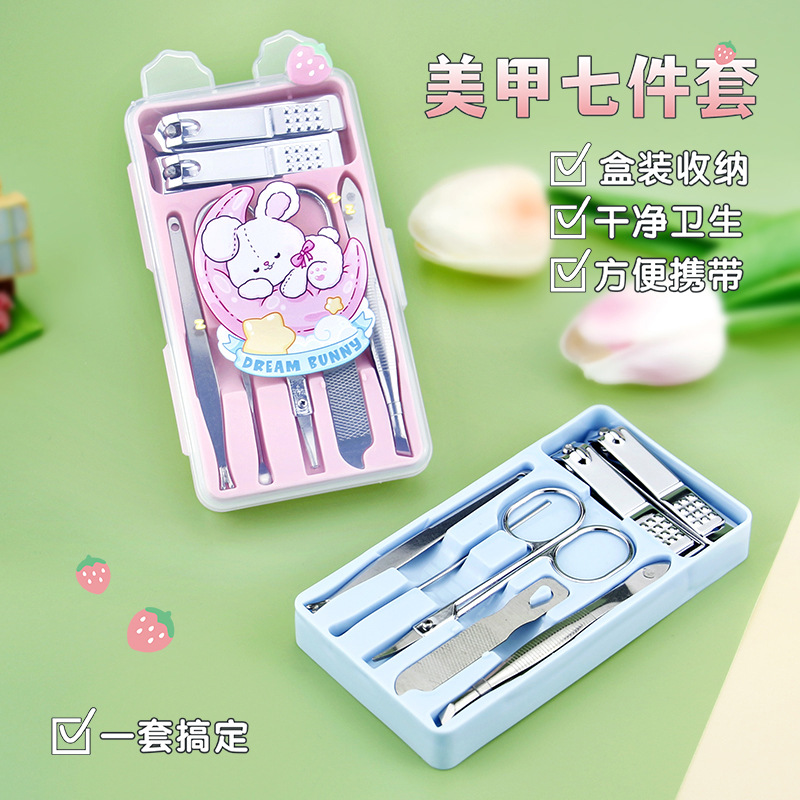 新款卡通草莓兔美甲七件套可爱少女心不锈钢指甲刀套装美甲套装
