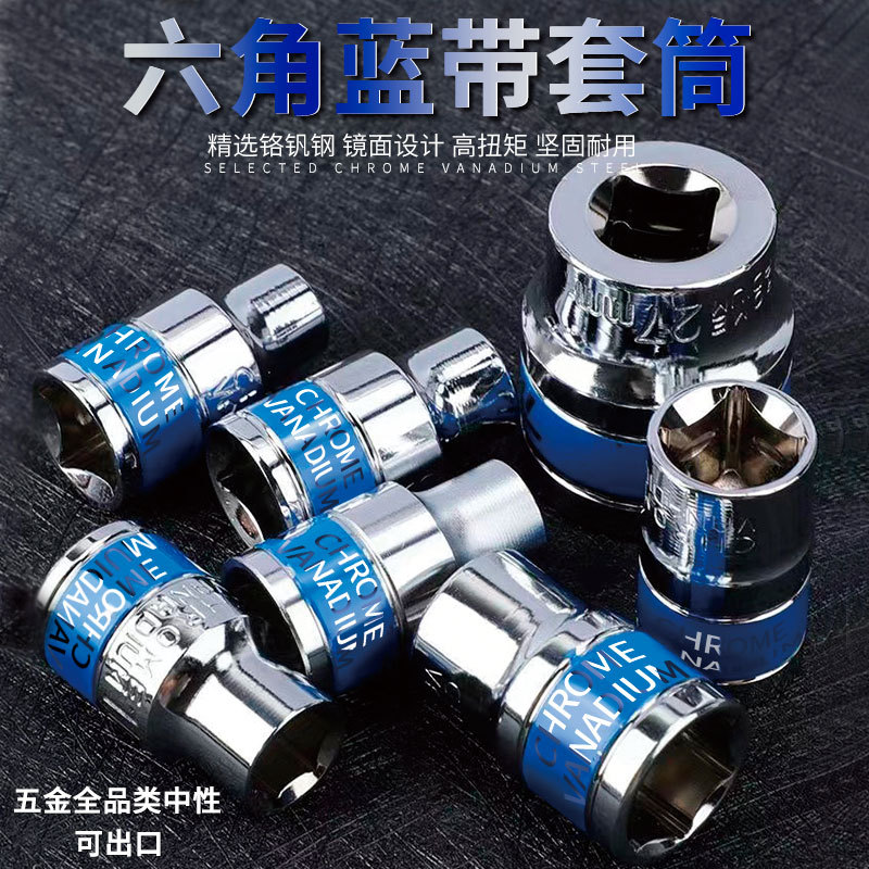 Soket sabuk biru krom vanadium, kunci pas elektrik kepala Lengan Pendek heksagonal universal 8-32 lengan pullover kelas industri