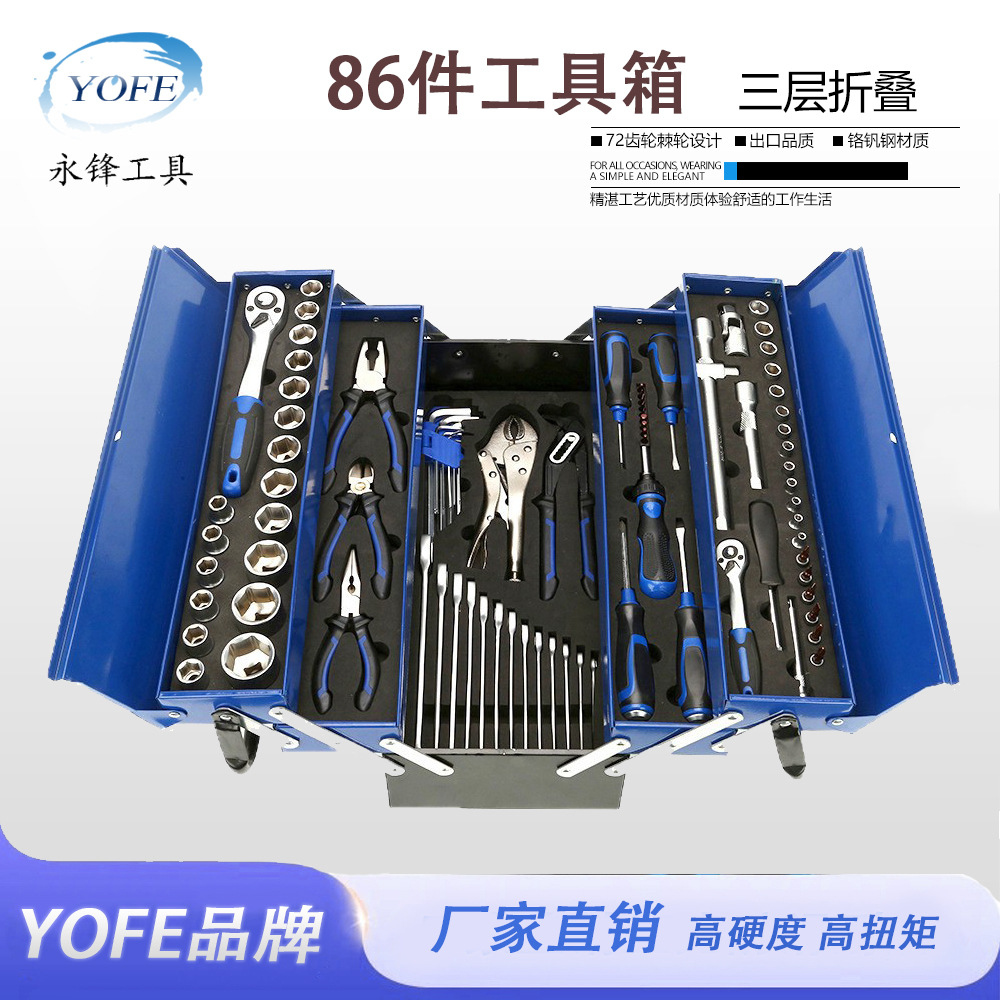 Set perkakas rumah tangga Yongfeng 86 buah dalam kotak besi, termasuk kunci inggris, obeng, set soket, dan perlengkapan perbaikan mobil.