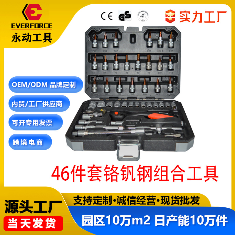 Set kunci kombinasi 46 buah, perlengkapan perbaikan mobil, kotak peralatan untuk penggunaan mobil dan modifikasi kendaraan energi baru dengan ratchet.