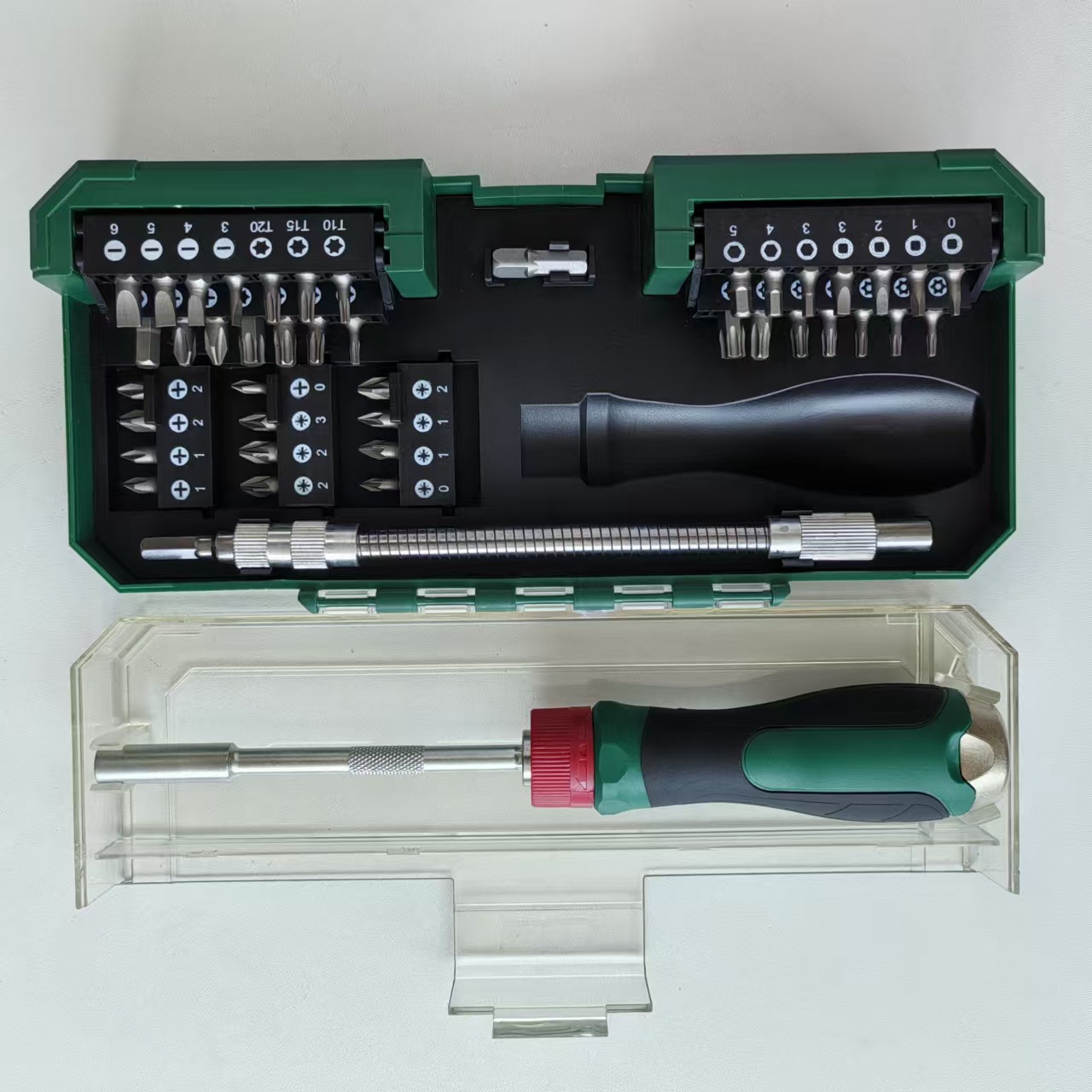 43PC keluar set LIDL PARKSIDE dengan pegangan model yang sama dengan ujung steker internal logam