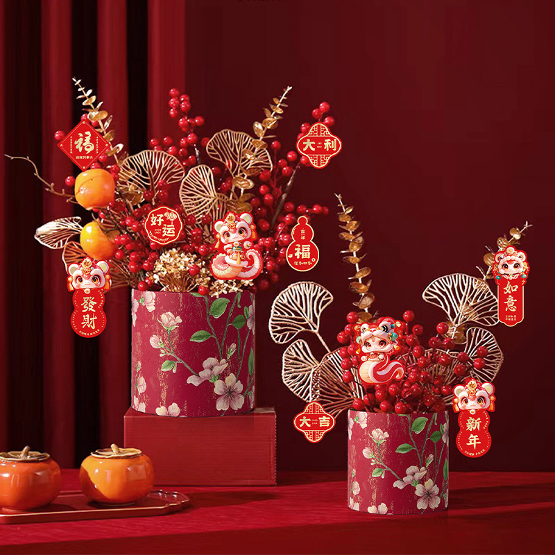 2025新款锦绣繁花套二福桶居家冬青红果装饰盒红色插花桶年宵花桶