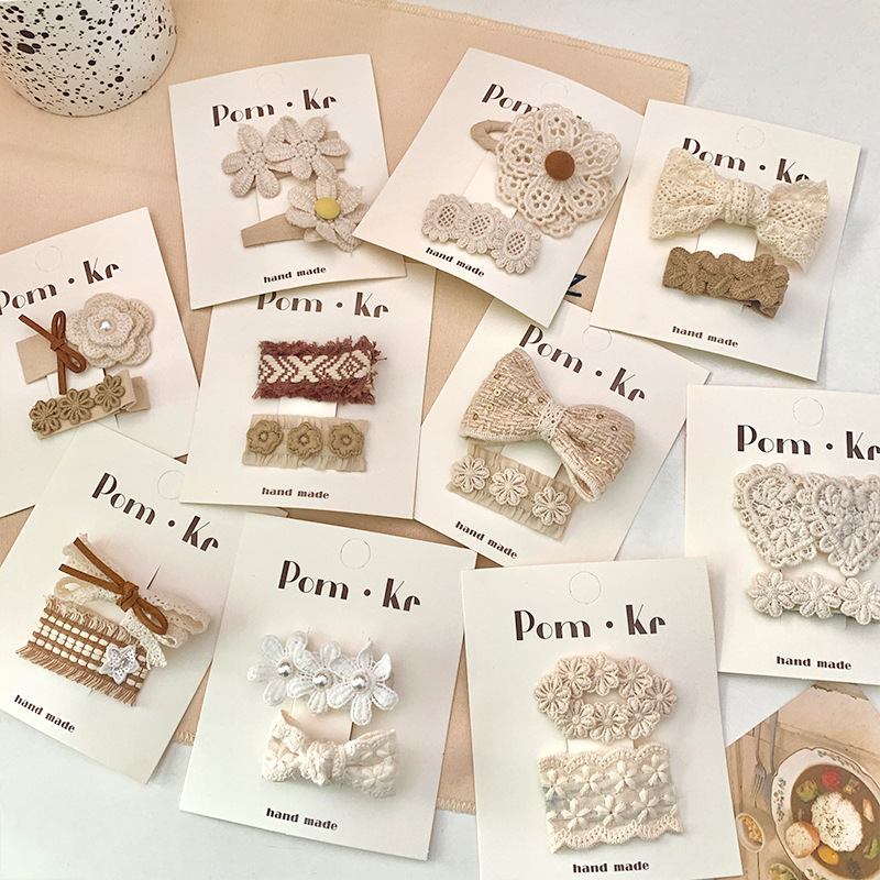 新款蕾丝奶咖色系格纹蝴蝶结布艺发夹儿童花朵对装发卡刘海夹边夹