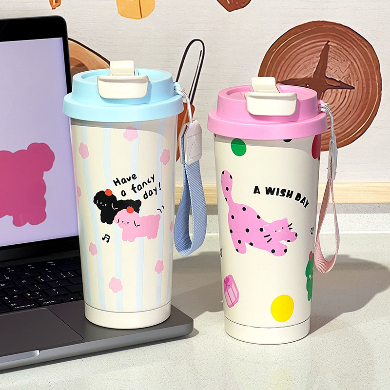 卡通可爱高颜值大容量新款保温杯不锈钢户外运动便携提绳咖啡水杯
