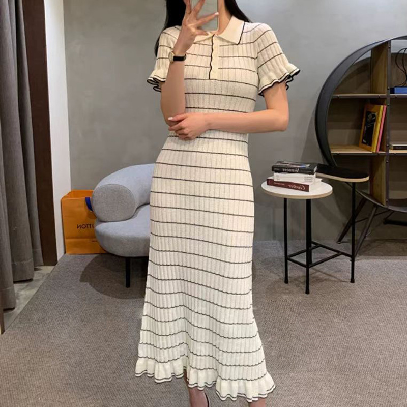 Rok Panjang Sedang Pinggiran Telinga Kerah Polo Model Baru Musim Panas Rok Ketat Terlihat Langsing Elegan Gaun Rajutan Warna Kontras Garis-Garis