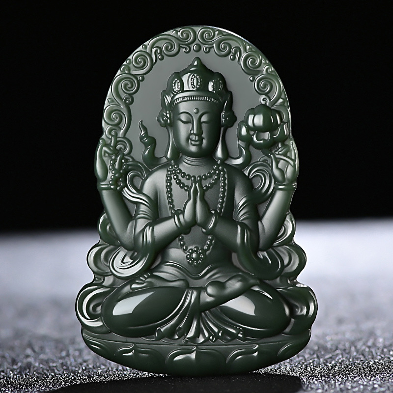 Hetian jade hijau menara giok hijau, satu bahan halus empat lengan liontin giok Guanyin pria liontin giok