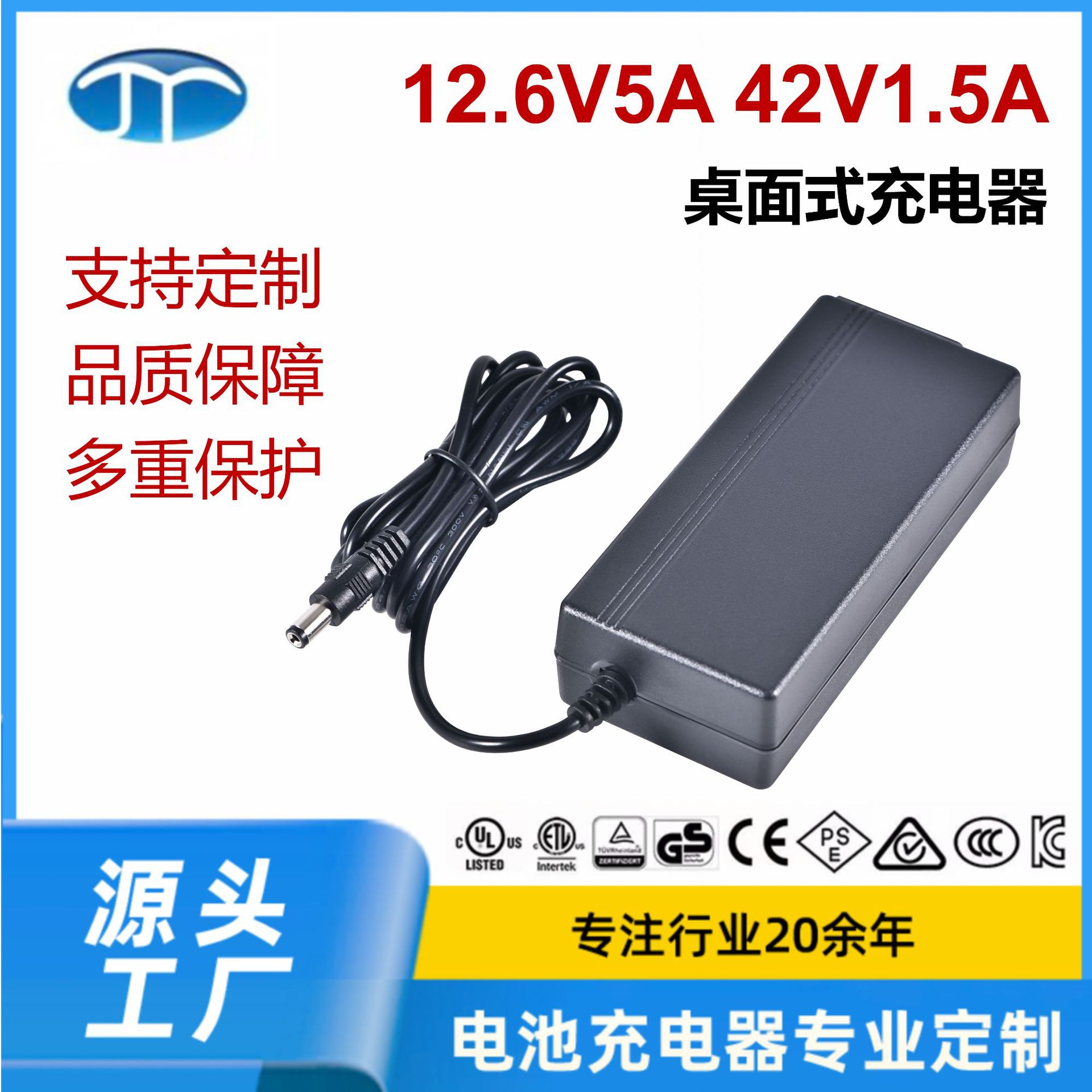 12.6V5A Charger Baterai Lithium Skuter 42V1.5A Pengisi Daya Desktop dengan Sertifikasi Keselamatan Multi-Negara