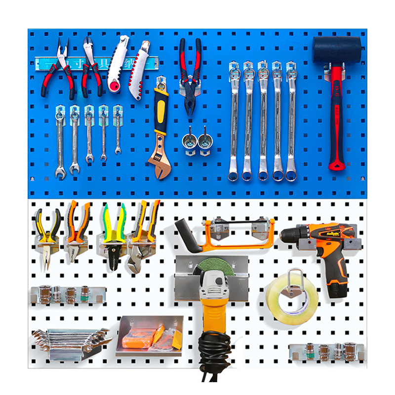 Rak penyimpanan alat lubang persegi logam, rak penyimpanan piring lubang persegi logam, rak dinding gantung, tampilan kait lubang persegi