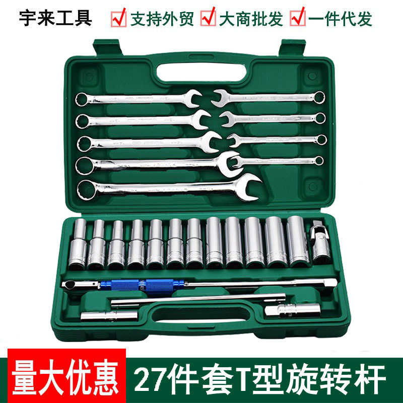 27 buah set alat perbaikan otomatis, kunci pas soket ratchet, alat kombinasi kepala batch, set batang berputar