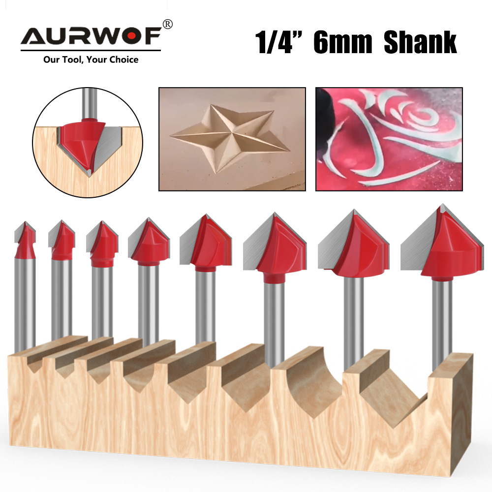 Set mata bor router merah berbentuk V 90 derajat, 6 buah, ukuran 1/4 inci, untuk memangkas, membuat slot pada panel aluminium-plastik, dan melipat tepi pada panel terintegrasi.