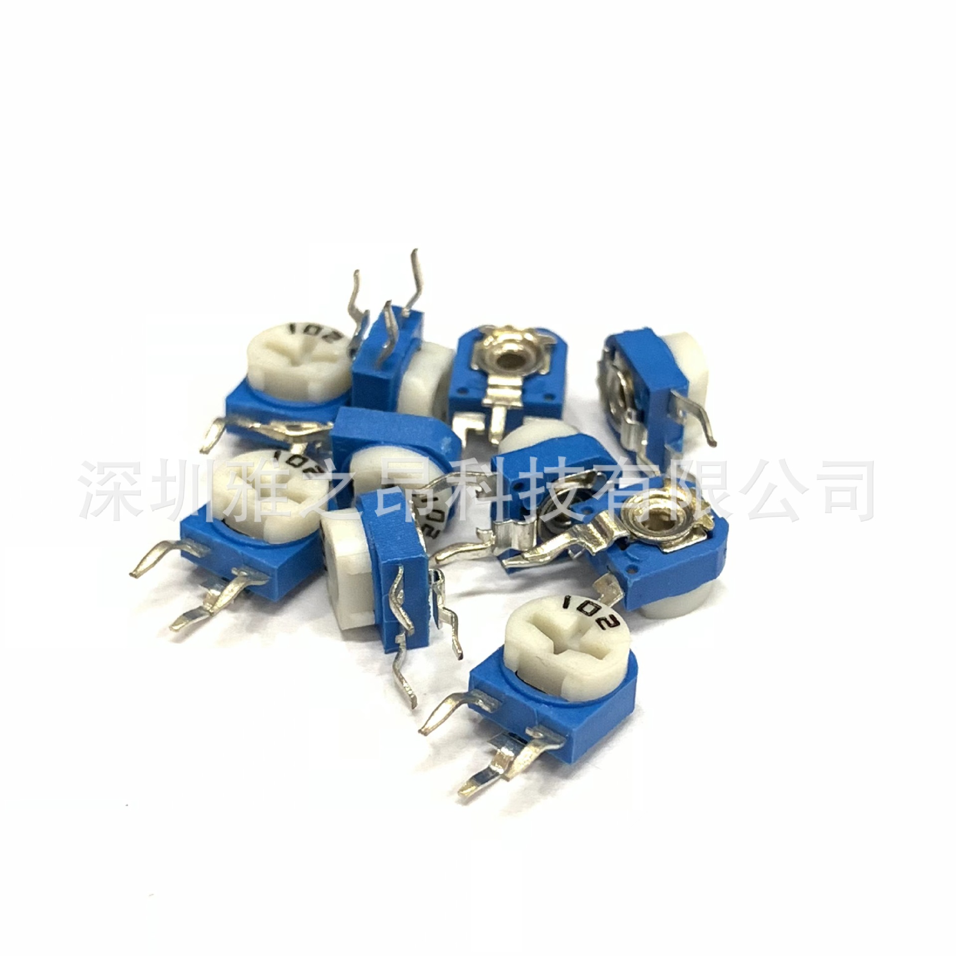 Potensiometer dapat disesuaikan horizontal biru dan putih, resistensi WH06-2/RM065 100 k-104 biru dan putih horizontal