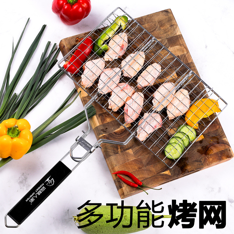 Jaring barbekyu lipat baja tahan karat, jaring barbekyu lipat pegangan kayu, jaring ikan panggang persegi