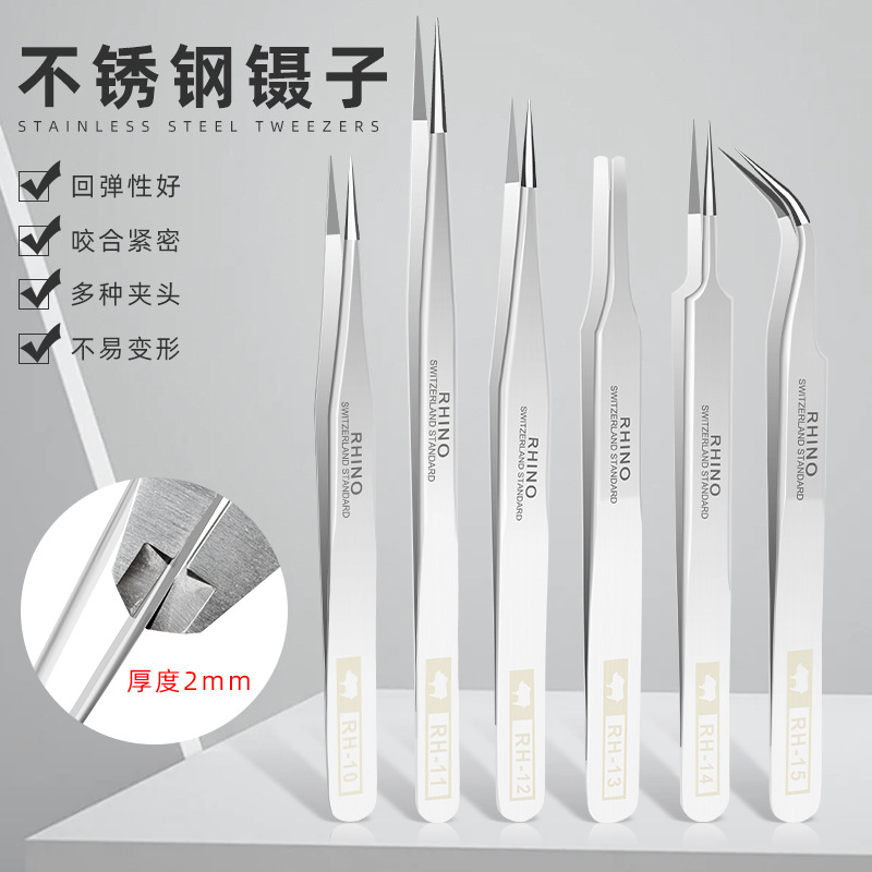 Pinset runcing baja tahan karat merek rhinoseros pinset perbaikan ponsel sarang burung Siku alat pemetik rambut klip penjepit foto RH