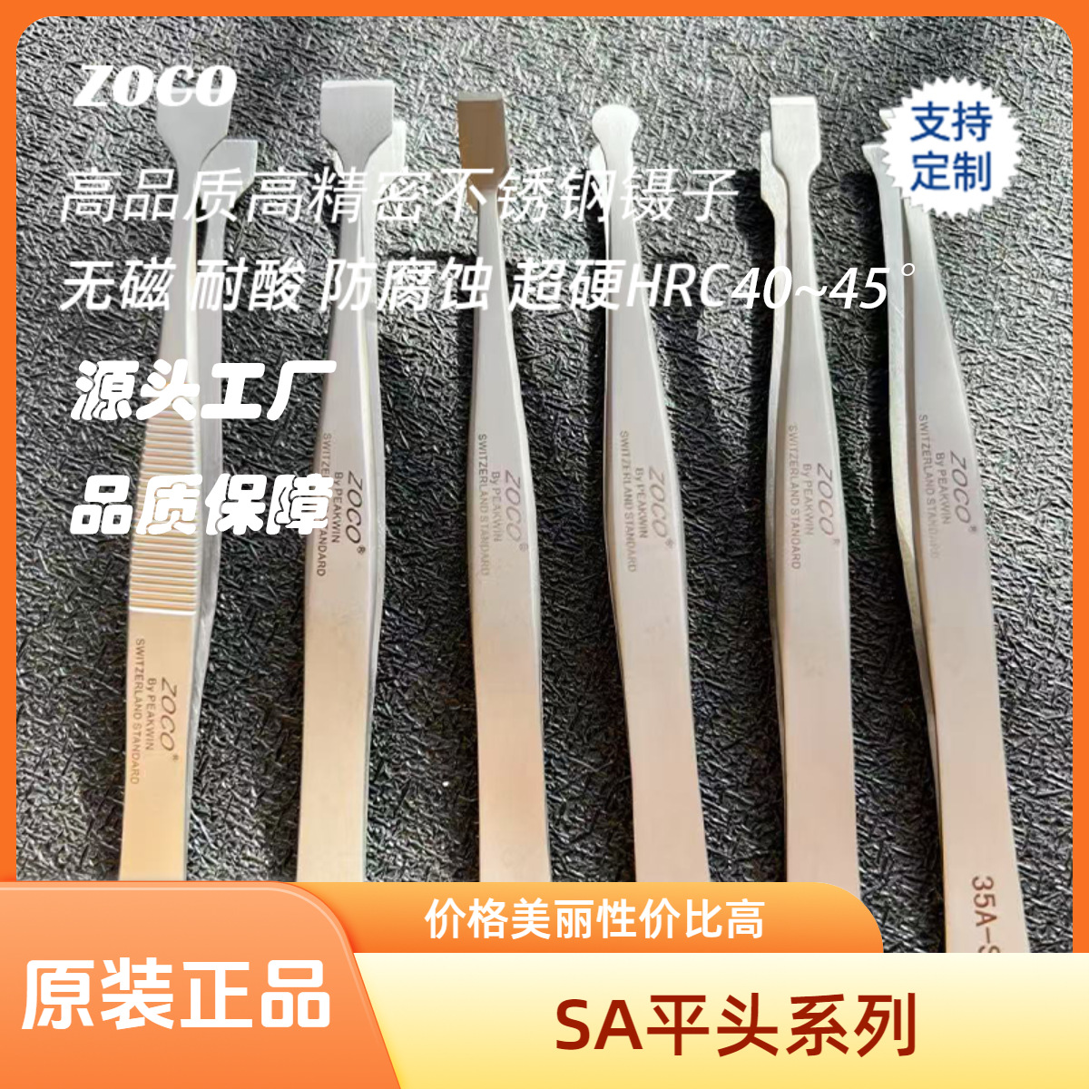 ZOCO presisi tinggi non-magnetik tahan korosi super keras HRC40 ~ 45 ° stainless steel memperluas pinset datar