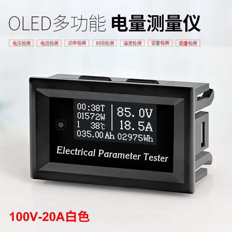 Pengukur daya voltmeter OLED 20A, pengukur daya termometer pengukur waktu kapasitas baterai