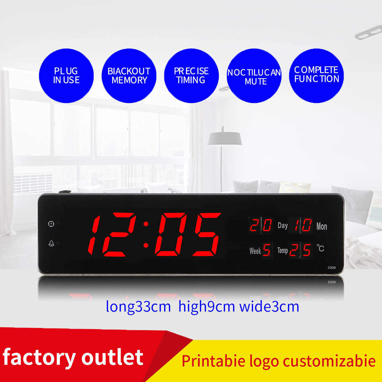 Pasokan langsung pabrik baru 3309LED perdagangan asing jam dinding elektronik ruang samping tempat tidur digital besar ruang tamu jam alarm