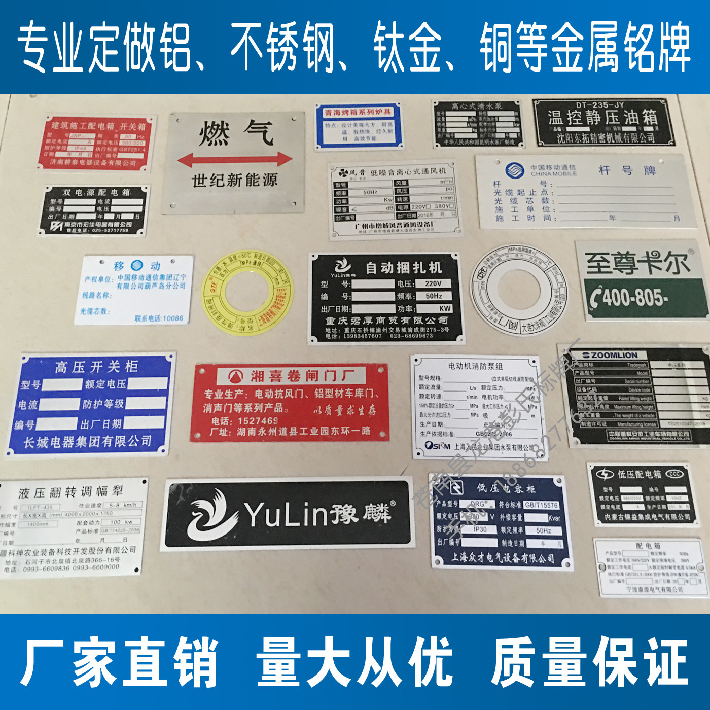 Tanda aluminium cetak layar, label aluminium terukir, plat nama mesin dan peralatan, tanda identifikasi listrik, tanda aluminium khusus, tanda keselamatan.