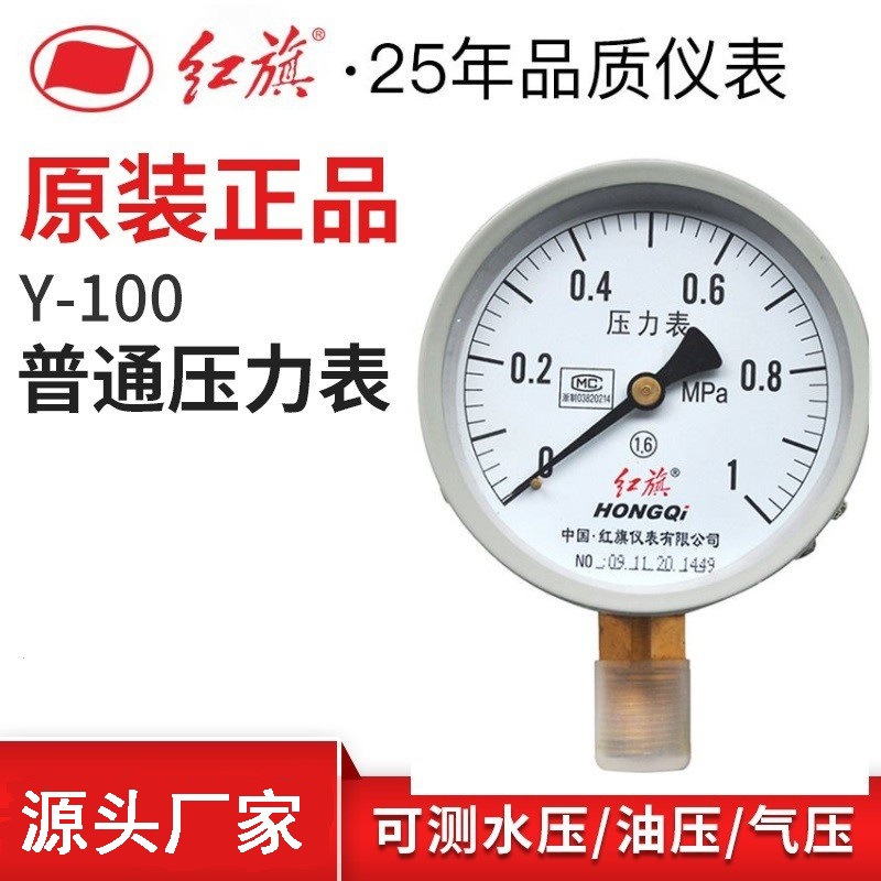Instrumen bendera merah meteran tekanan vakum aksial radial Y-100 meteran tekanan air tekanan udara keran pengukur air 0-1, 6mpa