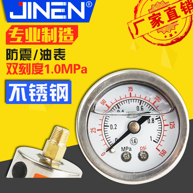 Pengukur minyak tahan guncangan Y-40NZ pengukur tekanan udara 1,0mpa aksial PT1/8 pengukur tekanan cangkang baja tahan karat