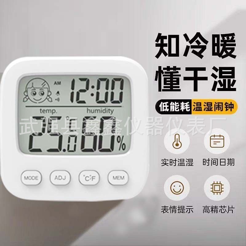 Alat pengukur suhu dan kelembaban elektronik rumah tangga dalam ruangan multi-fungsi layar besar tersenyum jam alarm pengukur suhu dan kelembaban digital elektronik