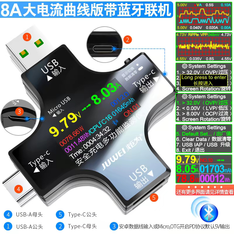 Ju Wei pendeteksi pengisi daya ponsel, charger ponsel tipe-c usb QC PD, pendeteksi tegangan Digital DC, ammeter