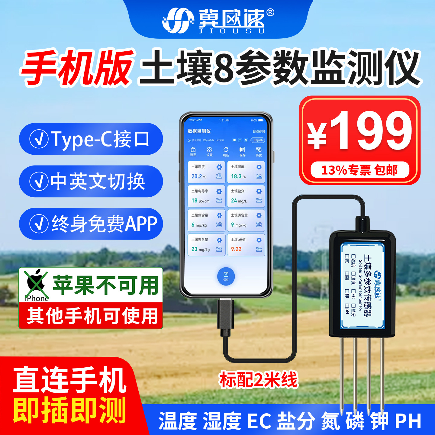 Alat uji tanah untuk suhu, kelembapan, nilai pH, nitrogen, fosfor, kalium, EC, kadar garam, kelembapan tanah, sensor tanah, data dapat dilihat melalui ponsel