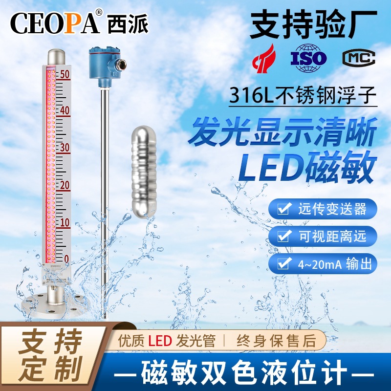 Pengukur level air dua warna sensitif, dengan panel transmisi jarak jauh, pengukur level air terpasang di samping, LED bercahaya dua warna