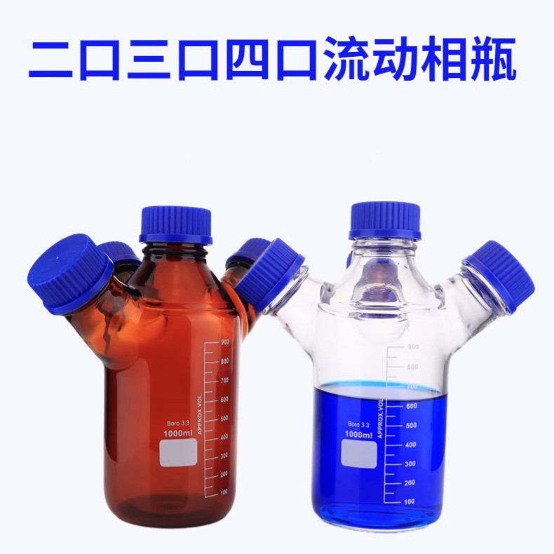 Botol cairan fase bergerak tiga-port/empat-port dengan tutup biru, botol reagen berulir, pelarut fase bergerak kromatografi cair HPLC