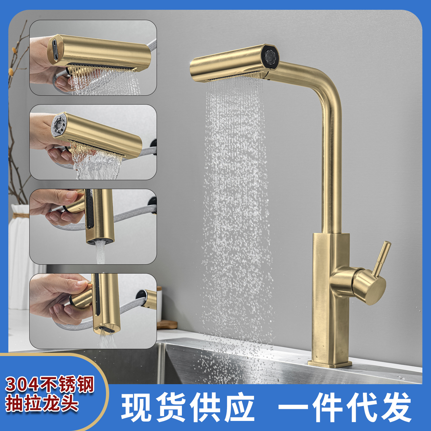 Keran dapur stainless steel, keran pull-out dapur, baja tahan karat 304, Brushed Gold, empat fungsi, keran hujan terbang, keran pull-out