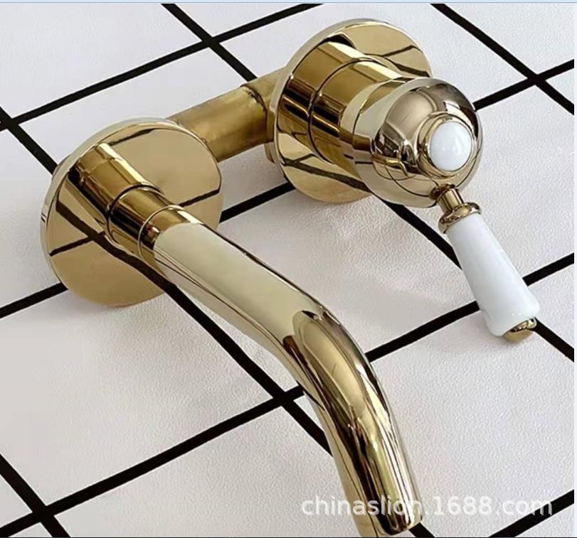 Keran wastafel dinding antik penuh kuningan, keran kamar mandi tersembunyi, keran wastafel panas dan dingin