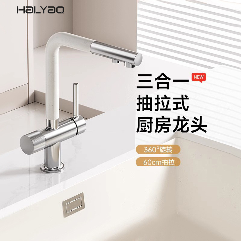 Keran Dapur Tipe Tarik Granit 3-in-1 Keran Keran Keran Tembaga Panas dan Dingin