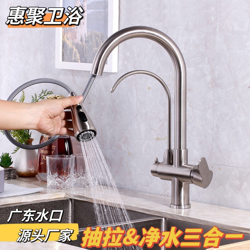 Keran tarik dapur baja tahan karat 304, keran rumah tangga tiga dalam satu dengan pembersih air keran panas dan dingin