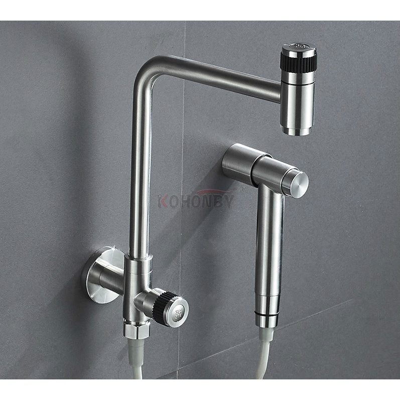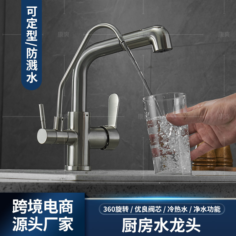 Keran tarik dapur baja tahan karat 304, keran rumah tangga tiga dalam satu dengan pembersih air keran panas dan dingin
