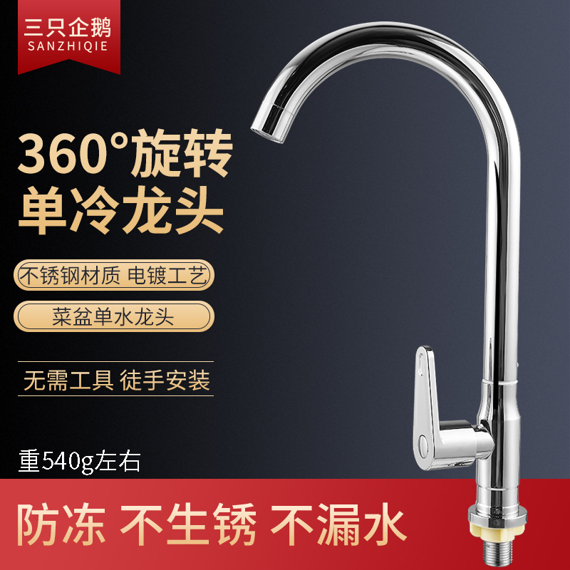 Keran dapur stainless steel 304, tahan percikan panas dan dingin wastafel tunggal rumah tangga berputar dingin