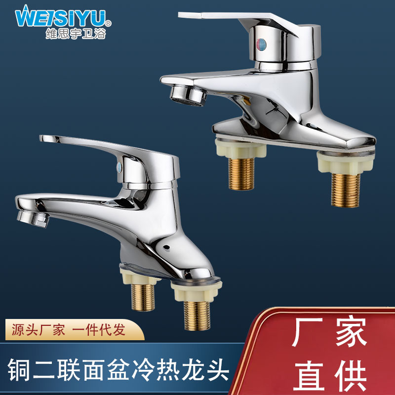 Keran wastafel dua sambungan, keran tembaga lubang ganda, keran wastafel kamar mandi, keran air panas dan dingin