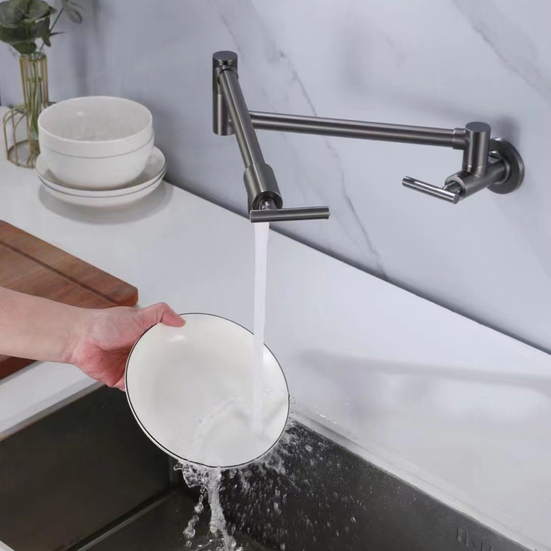 Keran dapur lipat tahan karat 304, keran dapur stainless steel diperpanjang untuk dinding, wastafel berputar universal, keran lubang tunggal dan dingin