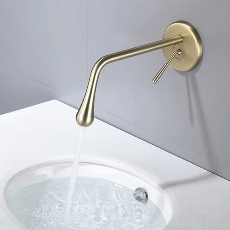 Keran wastafel tempel dinding, keran wastafel tersembunyi tetesan air, keran panas dan dingin, keran wastafel emas terpasang di dinding