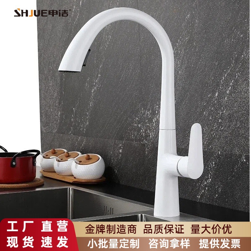 Keran pull-out tembaga putih elegan, keran wastafel sayuran dapat ditarik otomatis panas dan dingin untuk rumah tangga