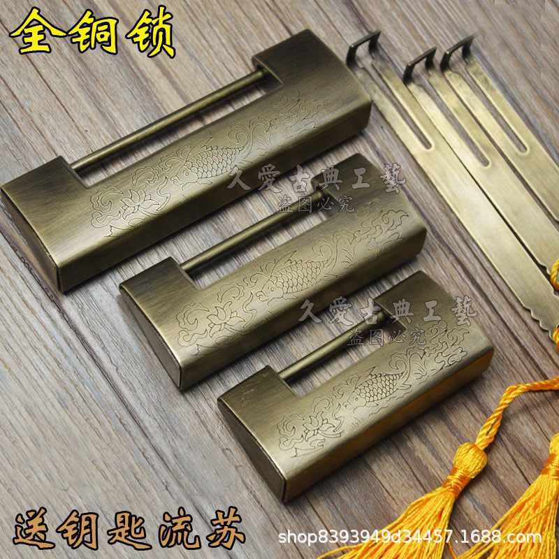 Gembok horizontal kuningan antik gaya Cina, kunci kuno ukiran vintage Semua tembaga kuno kunci latch horizontal kunci kotak kayu