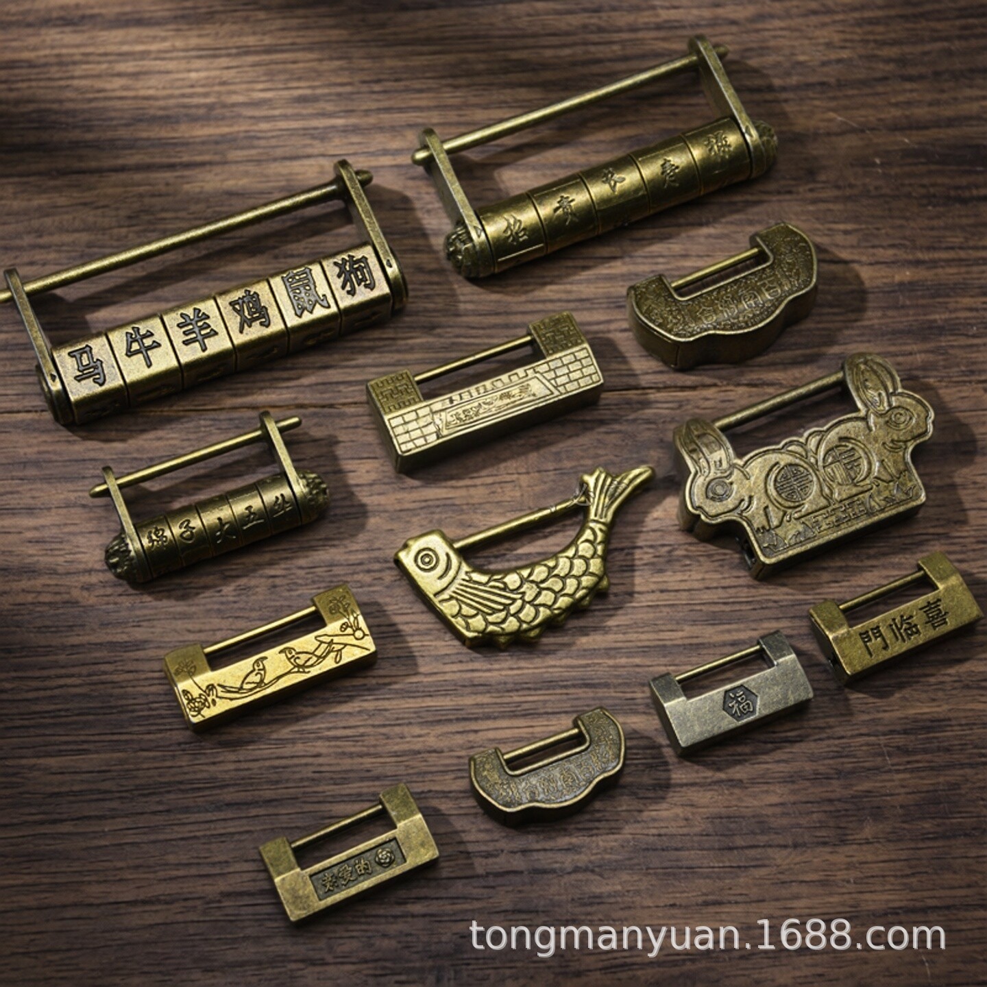 Kunci mini bergaya antik, kunci kecil dalam 26 desain bergaya Cina, gembok kotak vintage, kunci kuningan bukaan horizontal, kunci kombinasi kuno bergaya lama.