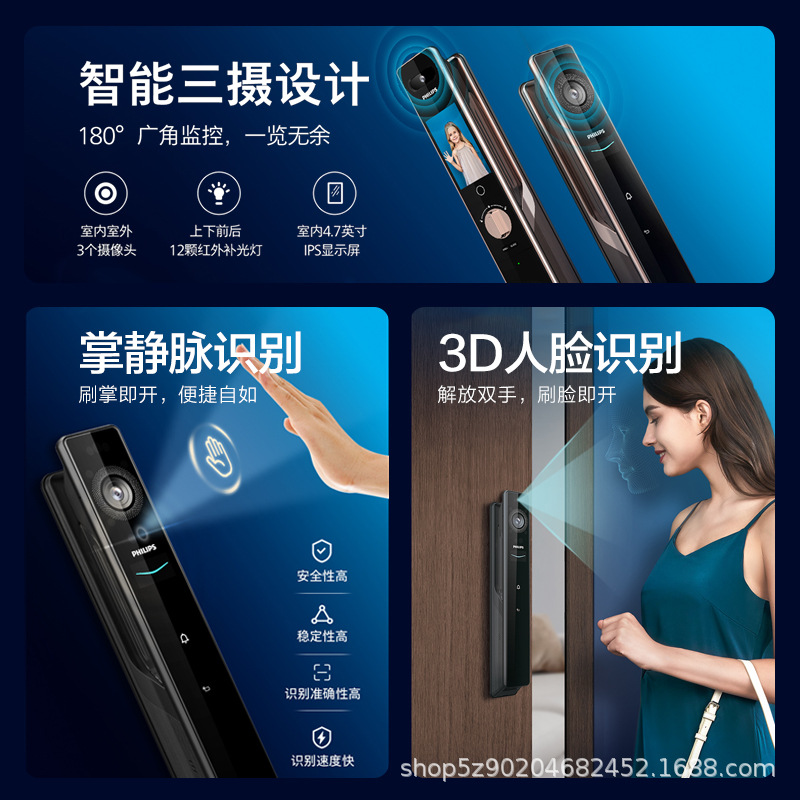 Philips Wajah Kucing Mata Palm Vena Kunci Pintu Cerdas Tiga Layar Besar Magnetik Pengisian Daya Pindai Sidik Jari Kunci Kata Sandi 902MVP