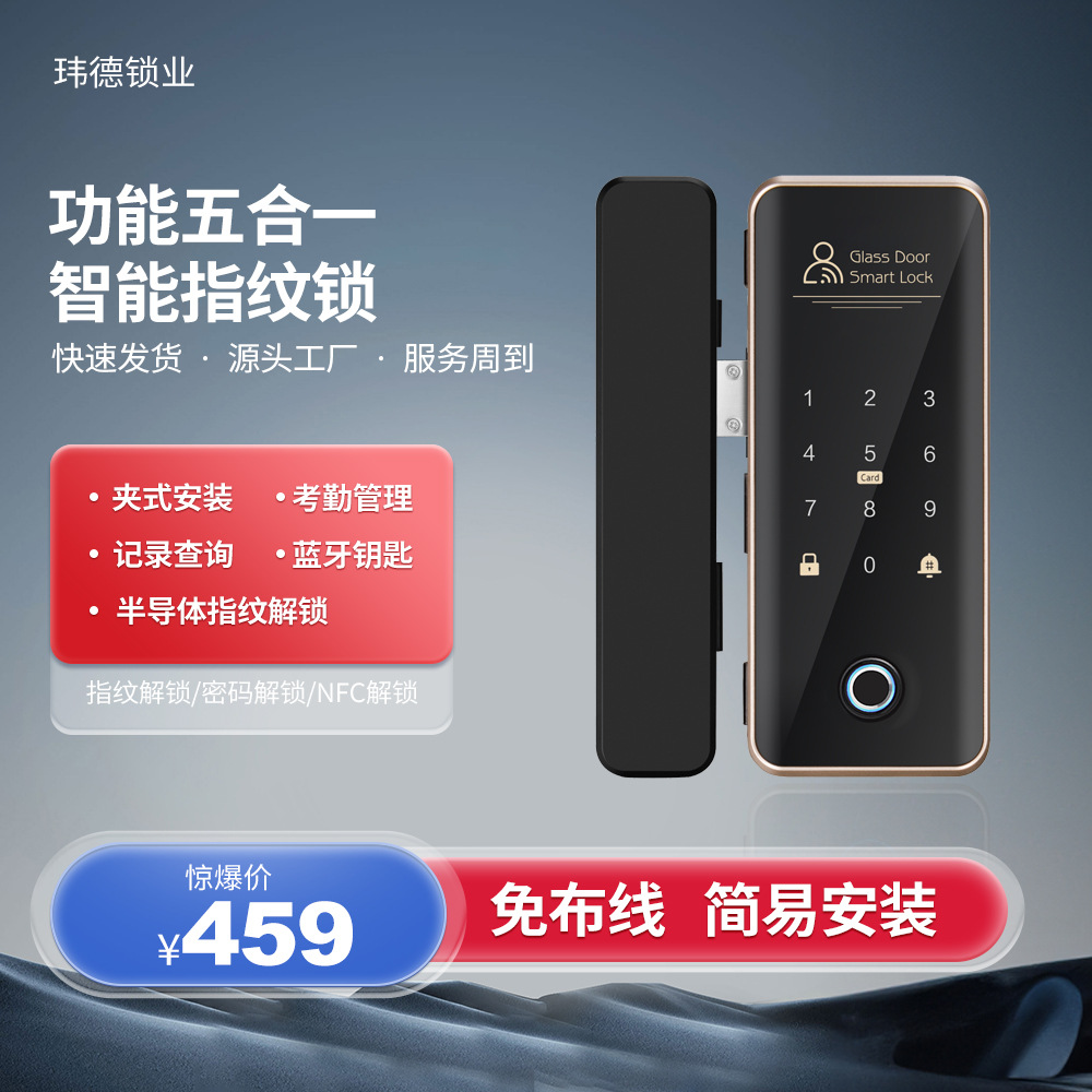 Kunci pintu kaca baru tanpa lubang kunci kaca pintar kustom tiga-dalam-satu kartu kata sandi sidik jari pintu ganda